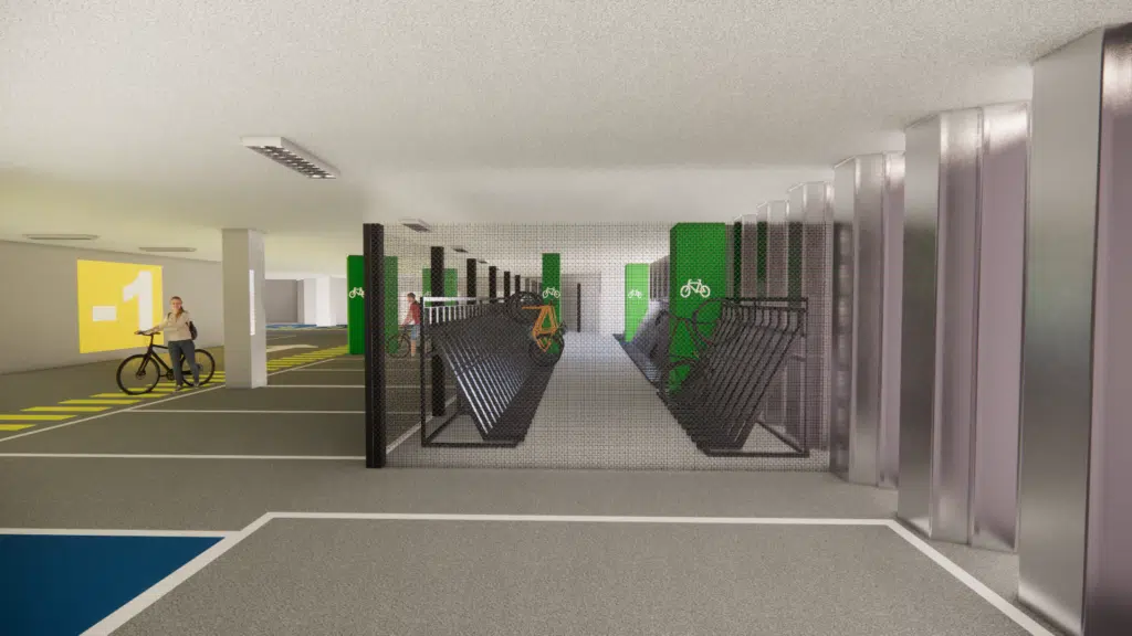 To make sure the spaces are easy to find, we designed super graphics and used bold colours for clear wayfinding and designated zones. The access routes for cyclists once inside the car park are wide but do not compromise or compete with car parking spaces – nobody wants parked cars (or expensive bikes!) being scratched.